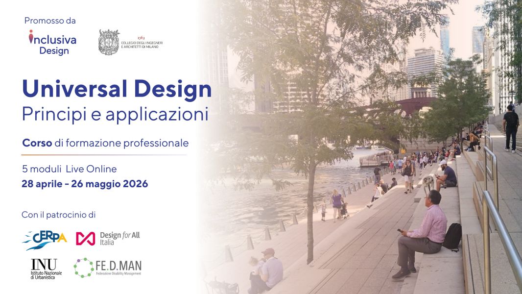 Dal 28 aprile al 26 maggio 2026 si terrà online il corso “Universal Design: principi e applicazioni”, promosso da Inclusiva Design e dal Collegio degli Ingegneri e Architetti di Milano, con il patrocinio dell'Istituto Nazionale di Urbanistica, CERPA Italia ETS, Design for All Italia e Fe.D.Man. – Federazione Disability Management. Il percorso formativo, articolato in 5 moduli live online, approfondisce l’approccio Universal Design e offre strumen