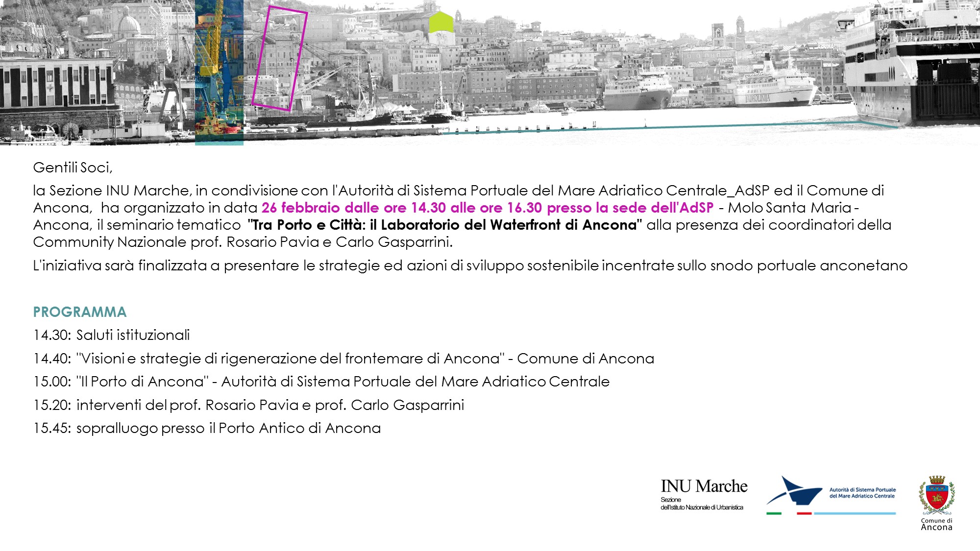 Inu Marche è tra gli organizzatori del seminario tematico “Tra Porto e Città: il Laboratorio del Waterfront di Ancona”, che si svolgerà il 26 febbraio prossimo ad Ancona. Le informazioni