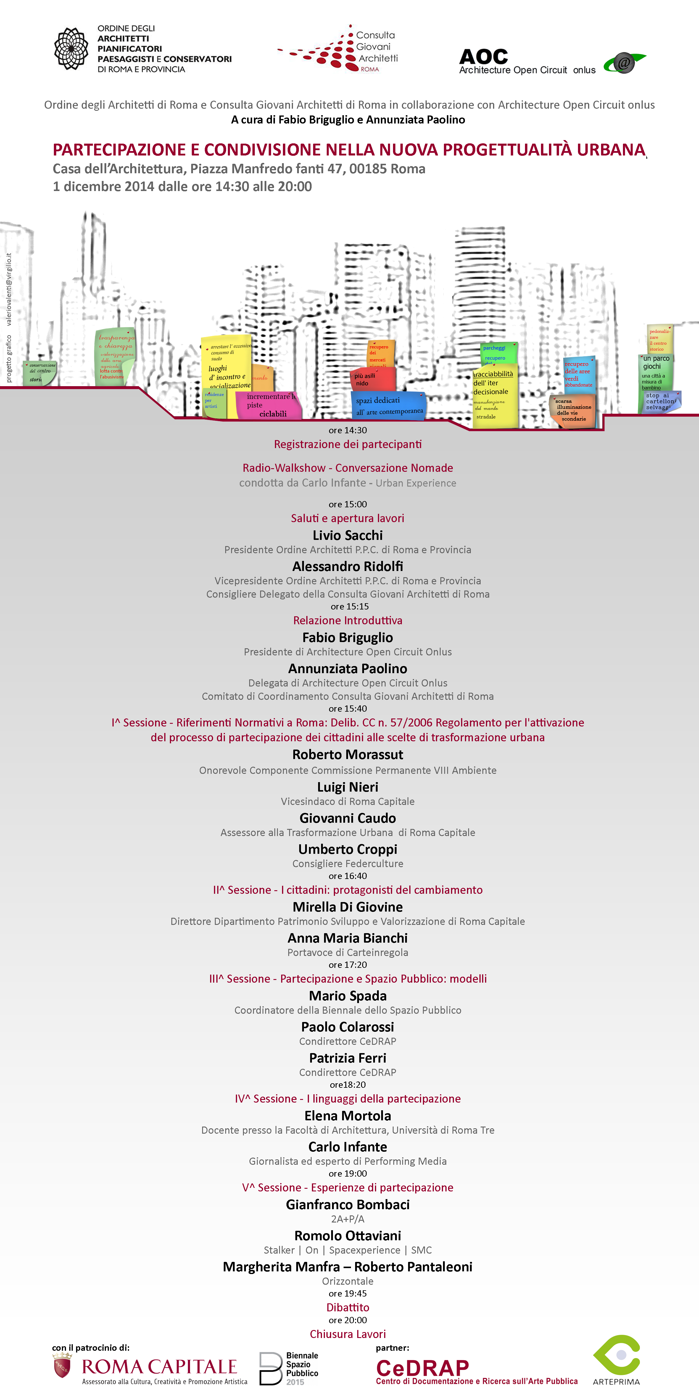 Lunedì 1 dicembre 2014, presso la Casa dell’Architettura, si terrà il convegno Partecipazione e condivisione nella nuova progettualità urbana, promosso dall’Ordine degli Architetti, Pianificatori, Paesaggisti e Conservatori di Roma e provincia e dalla Consulta Giovani Architetti Roma, in collaborazione con Architecture Open Circuit onlus.