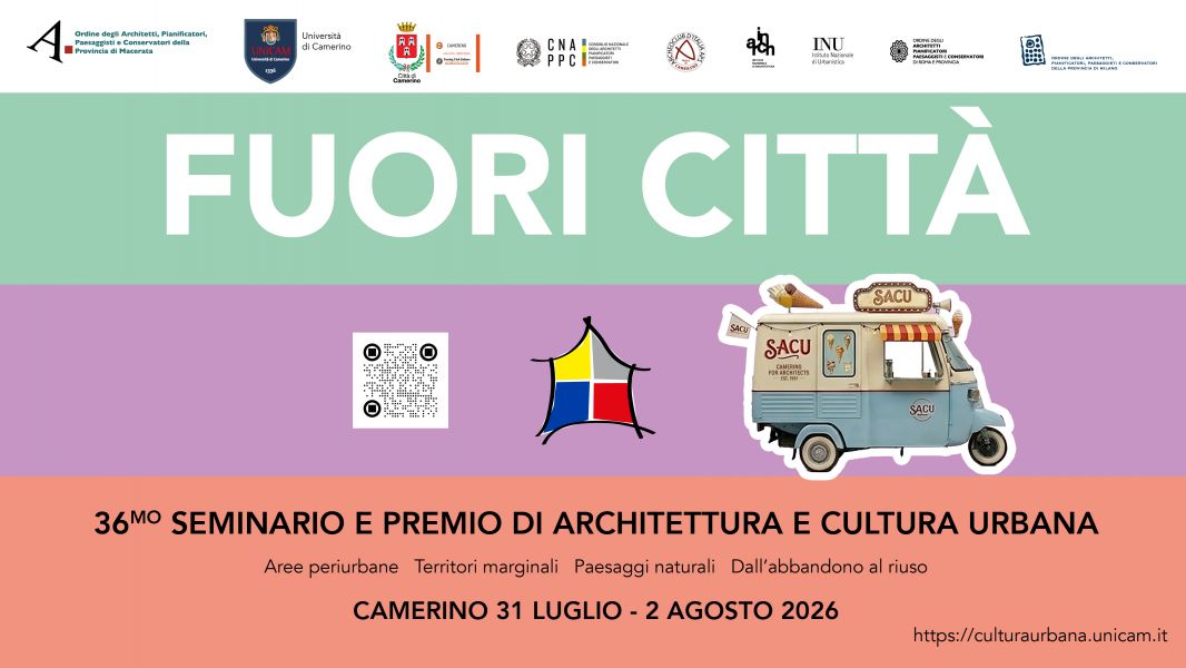 L'Istituto Nazionale di Urbanistica patrocina il 36esimo seminario internazionale e premio di architettura e cultura urbana dal titolo "Fuori città. Architetture, paesaggi, periferie".Si terrà dal 31 luglio al 2 agosto prossimi presso l'Università di Camerino. La pagina con il bando con le informazioni per partecipare